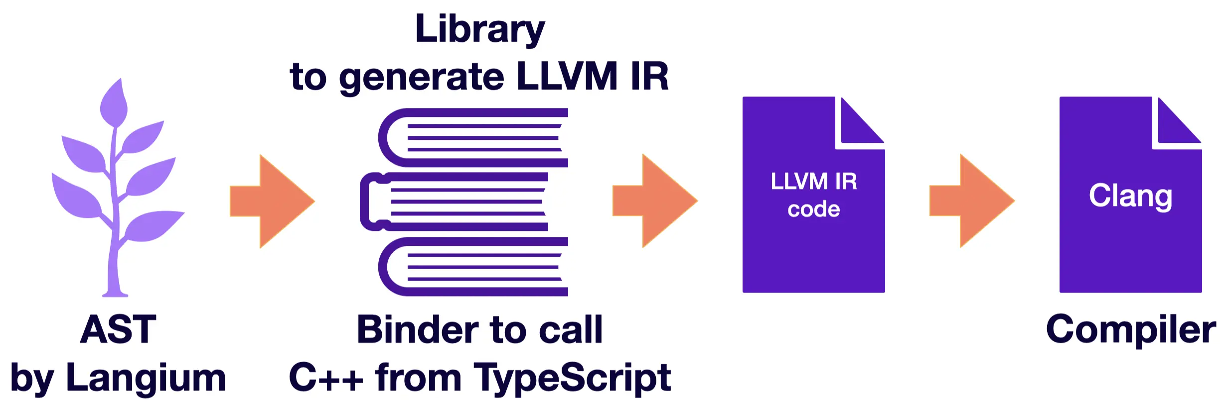 llvm-bindingsThe motivation of using the LLVM API is to generate LLVM IR code in a more convenient way. The API does not talk in untyped text, but in typed entities, like control flow blocks and variables, making it easier to put matching pieces together. We are using Typescript, so we need to use this bindings library to call the LLVM API from Typescript. Please be aware of the fact that this binding package is currently not maintained (Additionally, for Mac, the binaries are also outdated).