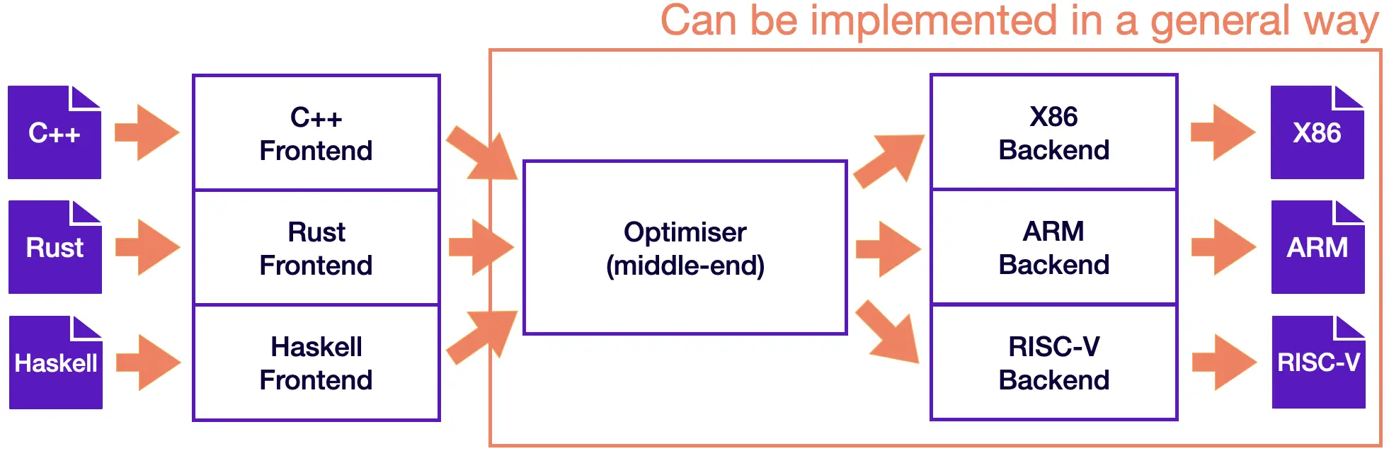 With this design, porting the compiler to support a new source language requires implementing a new frontend, but the existing optimizer and backend can be reused. If these parts weren’t separated, implementing a new source language would require starting over from scratch, so supporting N targets and M source languages would need N*M compilers. Just imagine having to develop 9 compilers to support C++, Rust, and Haskell for X86, ARM, and RISC-V!