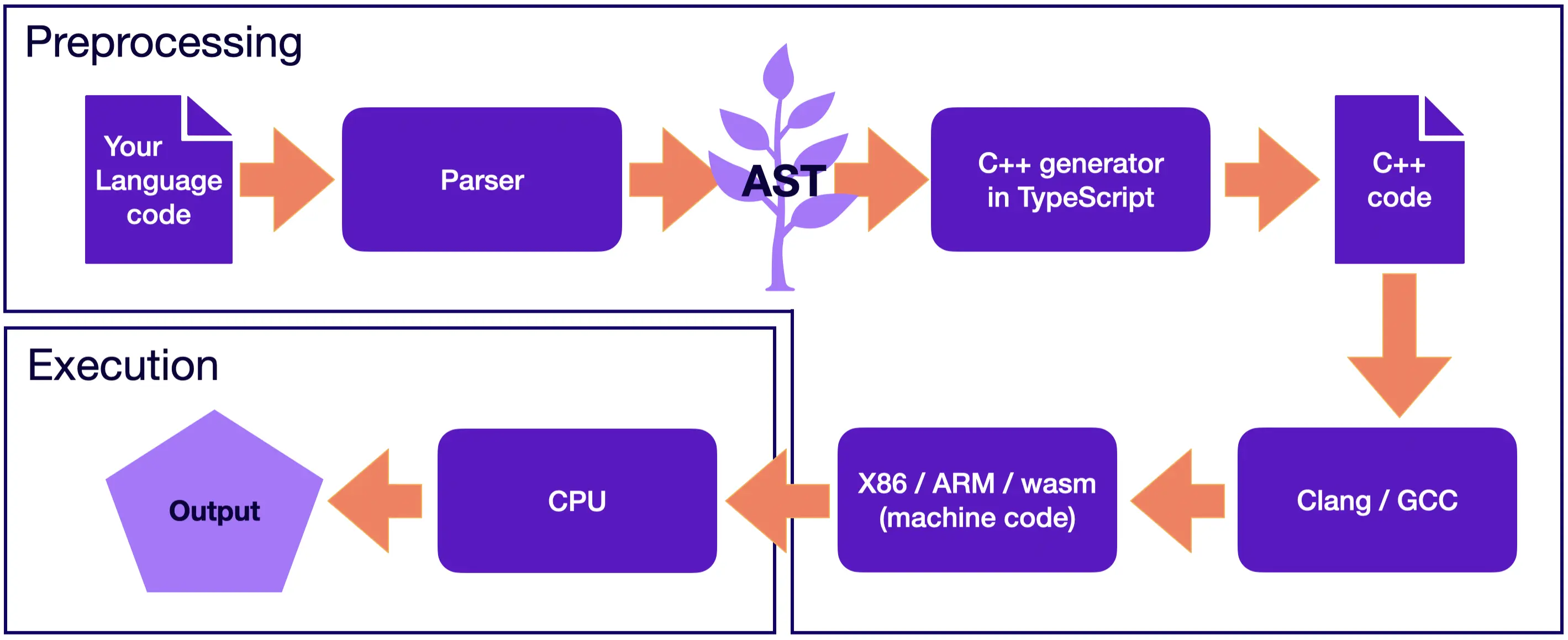 Looks like a perfect target language: the performance and all benefits of C/C++ will be achieved for your language! Let’s redraw the picture for the transpiler so that it uses C++.