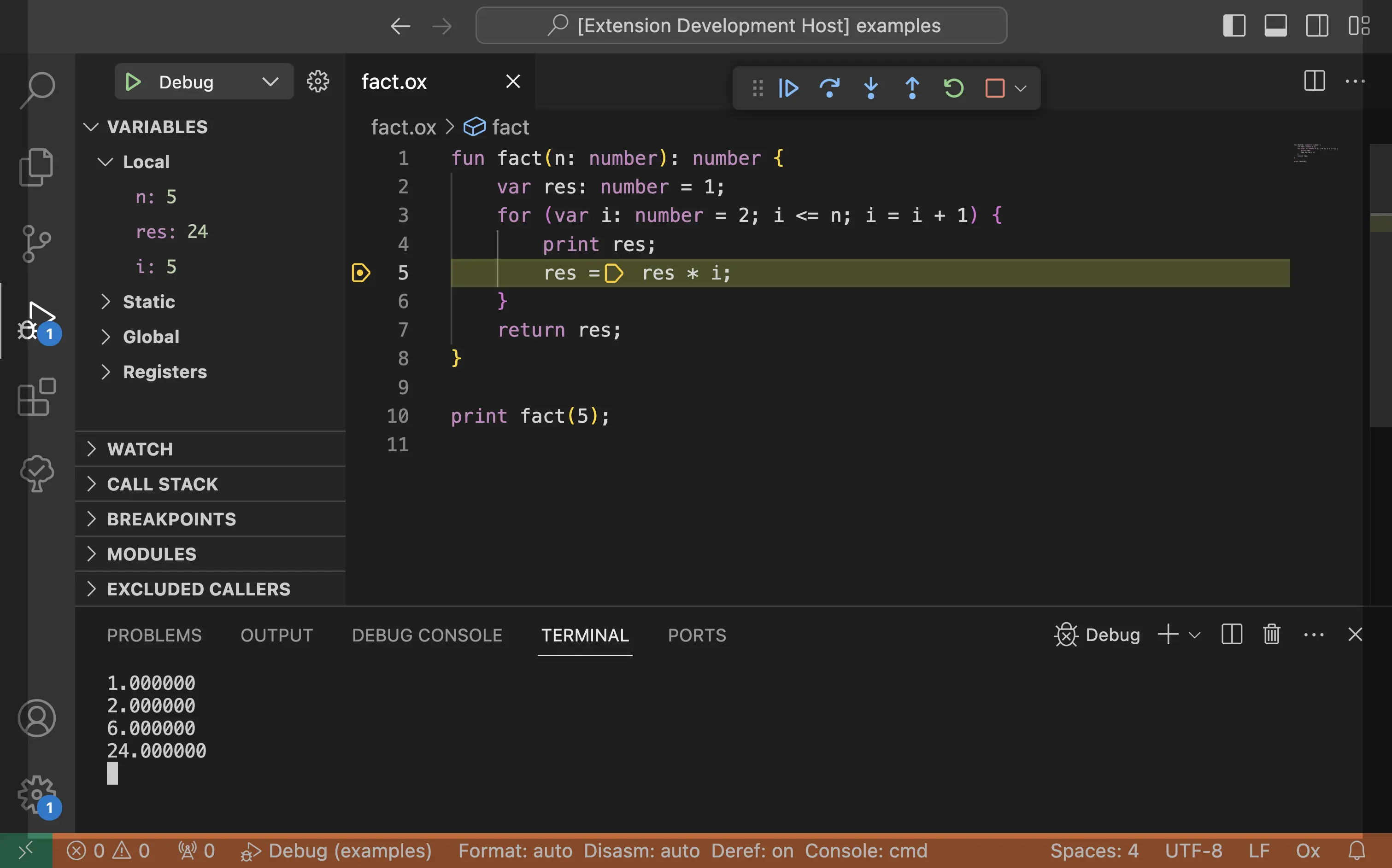 In the provided screenshot, the factorial program is written in own language, named Ox. Currently, we are running a real program in our own language in debug mode directly within VSCode!