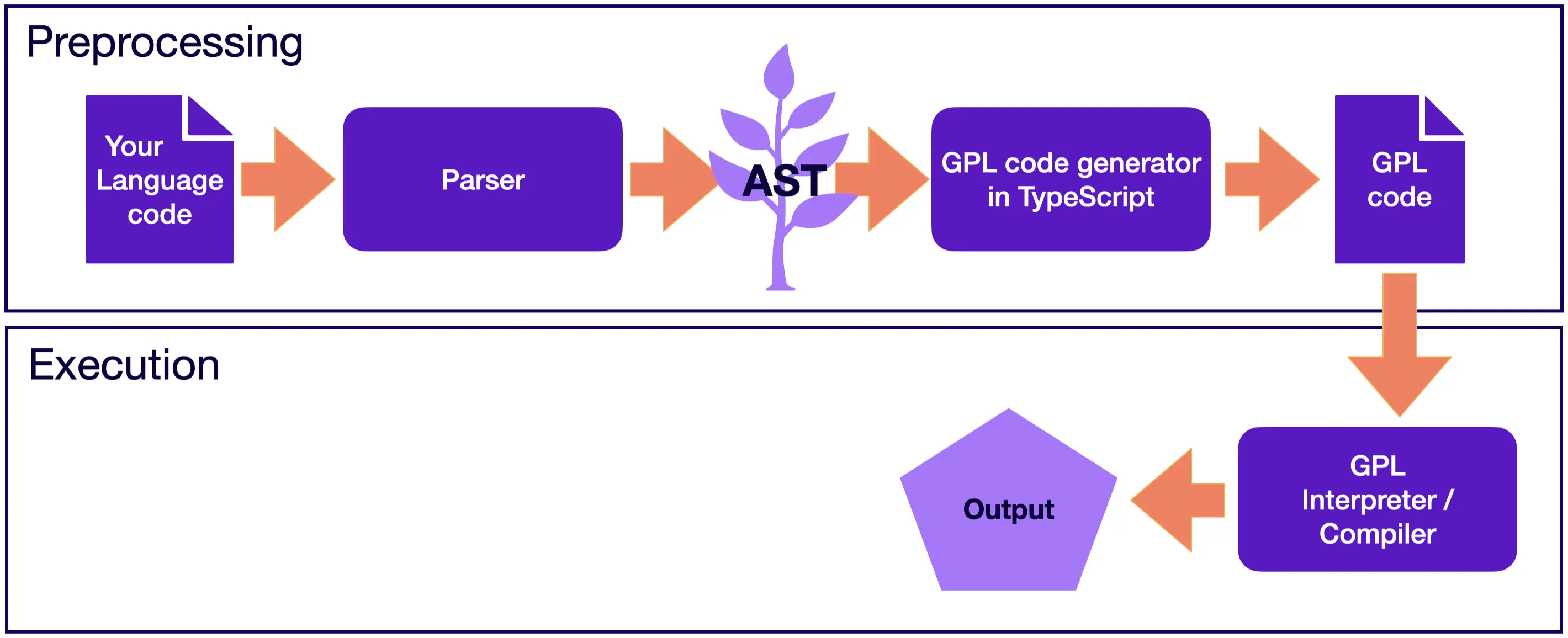 | Execution language | TypeScript (or any other language used by the interpreter) | Any that becomes the target language |